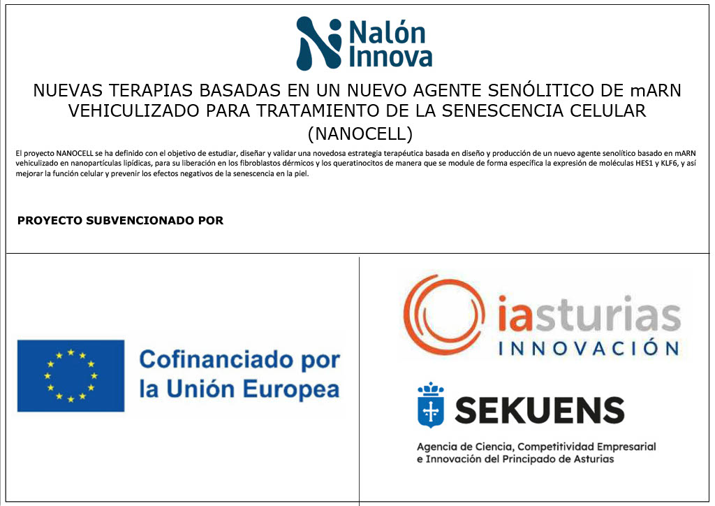 El proyecto NANOCELL se ha definido con el objetivo de estudiar, diseñar y validar una novedosa estrategia terapéutica basada en diseño y producción de un nuevo agente senolítico basado en mARN vehiculizado en nanopartículas lipídicas, para su liberación en los fibroblastos dérmicos y los queratinocitos de manera que se module de forma específica la expresión de moléculas HES1 y KLF6, y así mejorar la función celular y prevenir los efectos negativos de la senescencia en la piel.